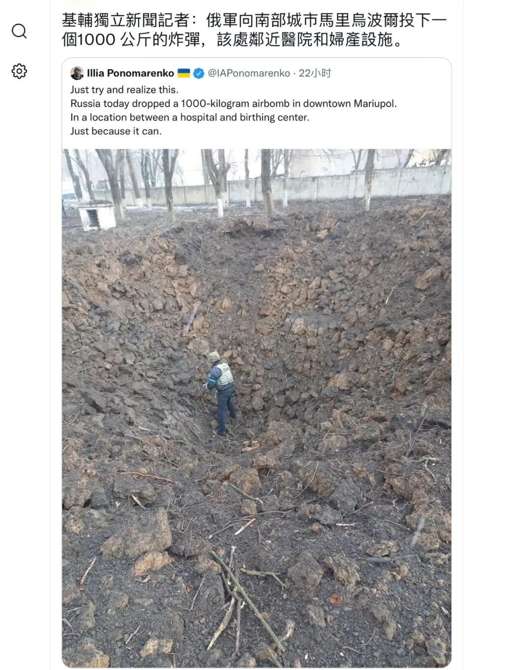当地时间9日,乌克兰方面称,俄军发射导弹袭击了马里乌波尔的一家妇产医院,造成至少17人受伤。基辅记者则称,俄军向医院投下了一枚1000公斤的炸弹,炸出数米深的巨坑。戏子总统斯基称之为“暴行”,并表示有母亲、孩子和医护人员被埋在废墟之下。