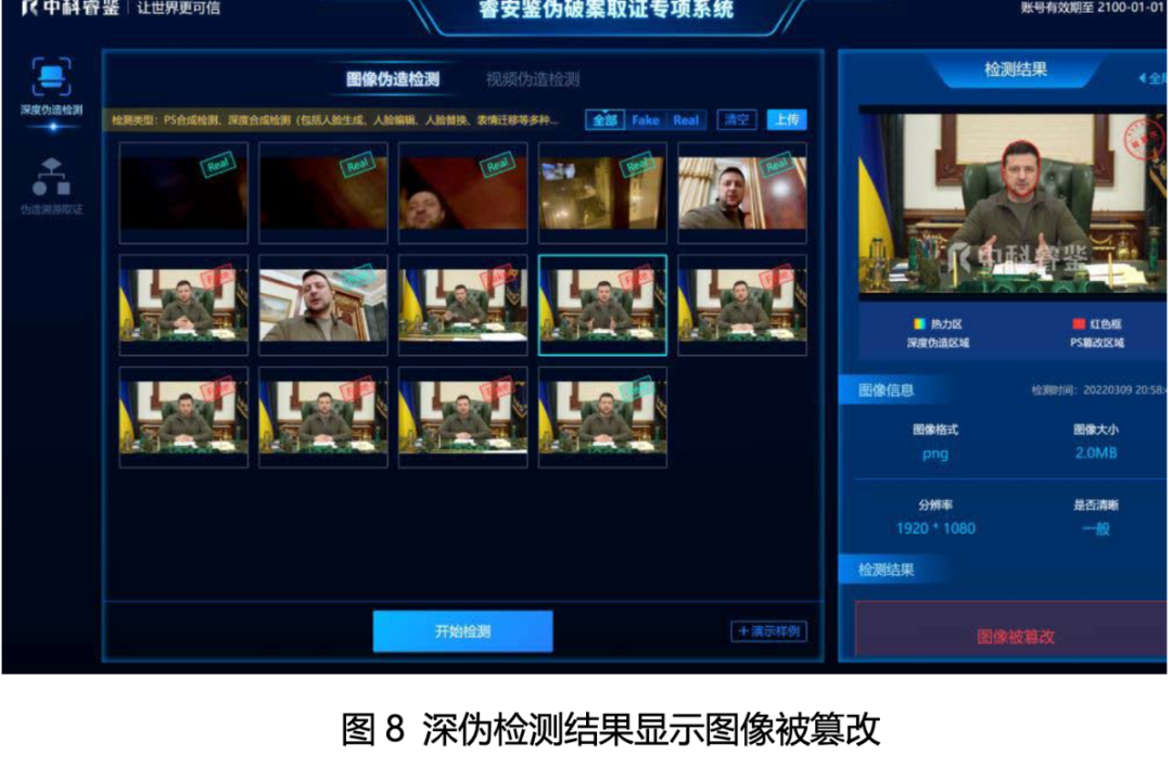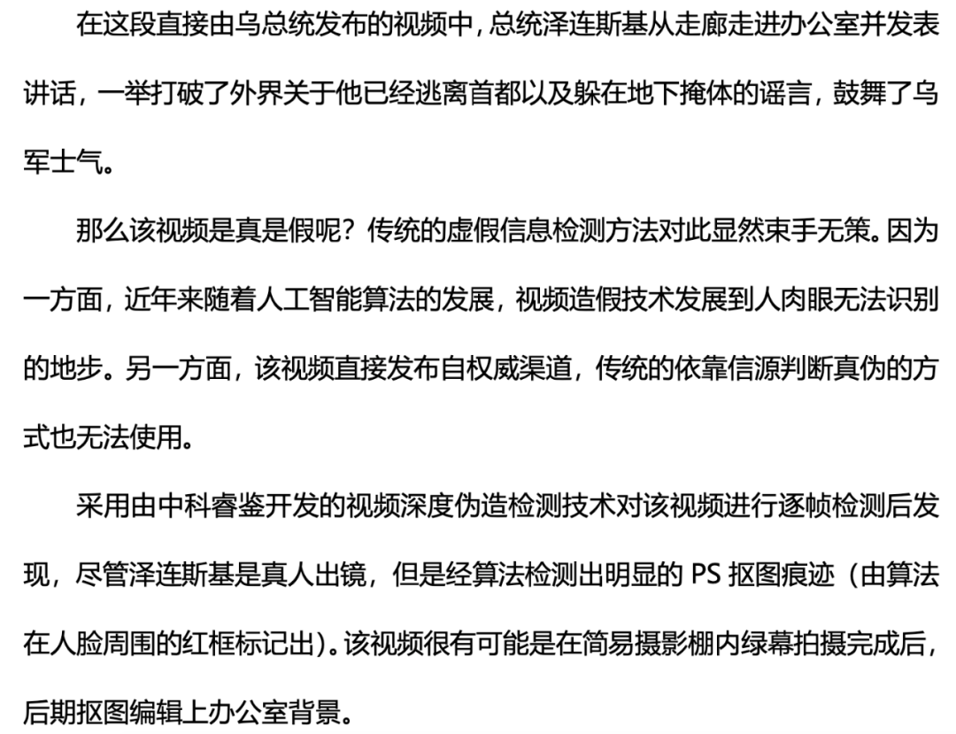 换言之,《俄乌冲突中的深度伪造虚假信息报告分析》文件中说:“尽管泽连斯基是真人出镜,但是经算法检测出明显的PS抠图痕迹(由算法在人脸周围的红框标记出)。该视频很有可能是在简易摄影棚内绿幕拍摄完成后, 后期抠图编辑上办公室背景”的结论,大概率是真的。