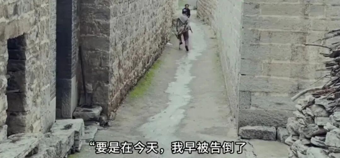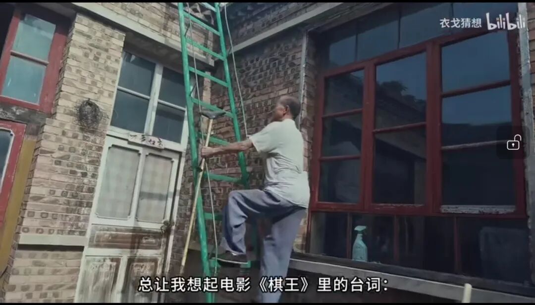这是要干嘛?爬梯子根本不需要拐杖。爬到房顶上,房顶是平的,“二舅”能在平地上走路,五秒走五步,不需要拐杖,为什么要拿着拐杖到平坦的房顶上?