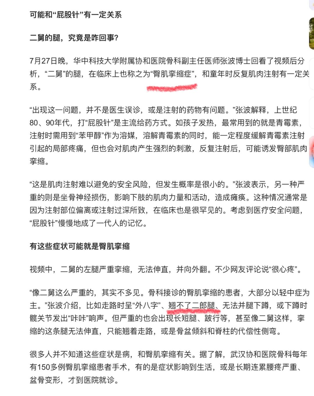 7月27日晚,湖北日报旗下“极目新闻”采访了华中科技大学附属协和医院骨科副主任医师张波博士,该博士分析后认为,“二舅”的腿在临床上称之为"臀肌挛缩症”,是因为他小时候注射青霉素时需用到“苯甲醇”作为溶媒,但苯甲醇会对肌肉产生强烈的刺激,反复注射后,可能诱发臀部肌肉挛缩。