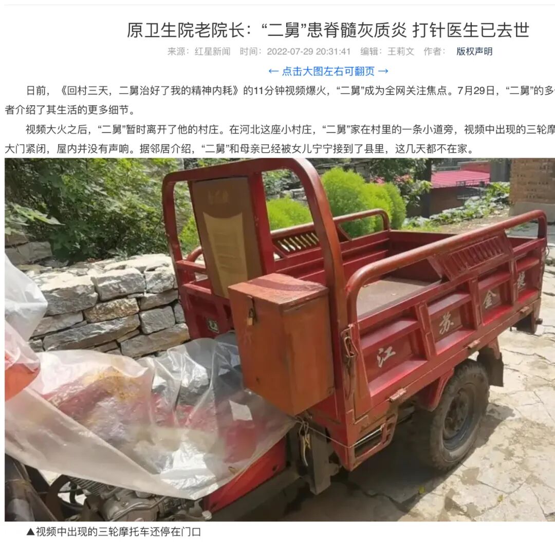 老院长说,他也曾为“二舅”看过病,“这个事我知道,一开始是高烧,后面打完针后就出现这个情况,后来是麻痹”,“一开始打的不是这个屁股,后来到这屁股上了。”在老院长看来,“二舅”患了脊髓灰质炎(俗称小儿麻痹症),并非打针(直接)导致残疾。而为“二舅”打针的医生已经去世。
