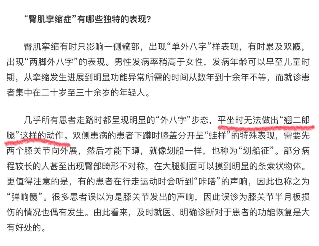 上海交大附属第九医院的骨科专家王晓庆主任也在以前文章中指出,臀肌挛缩症几乎所有患者,平坐时无法做出“翘二郎腿”这样的动作。