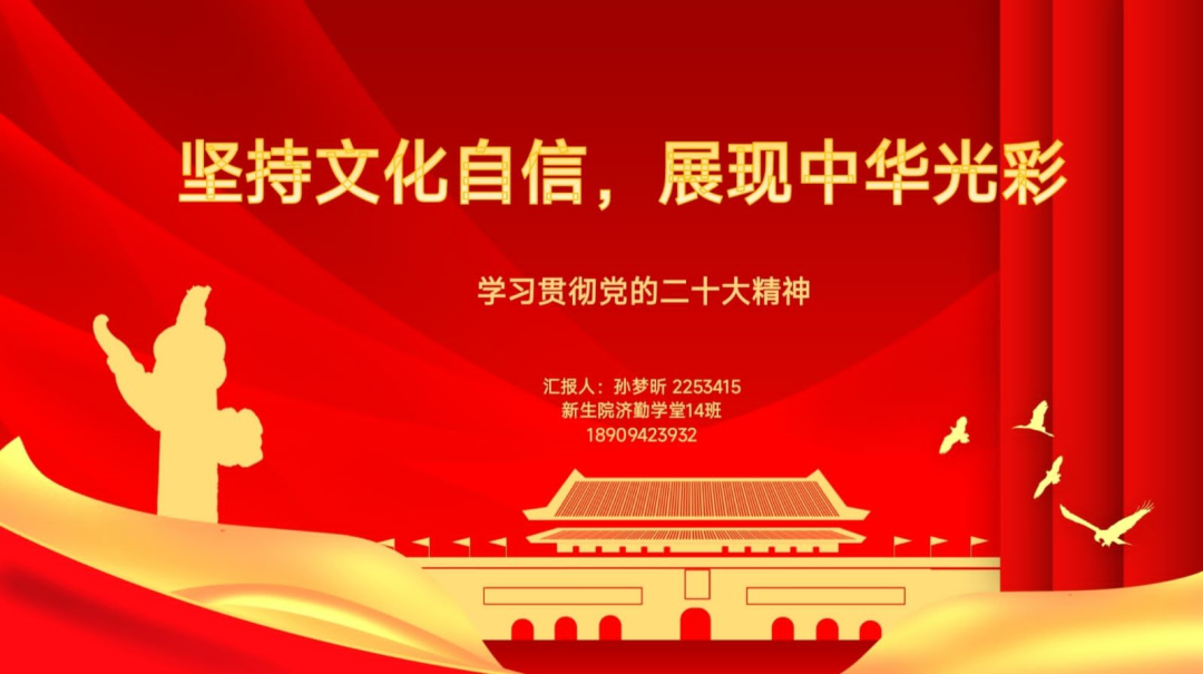 孙同学从文化自信的意义内涵、文化自信的体现等方面的内容出发,强调了讲好中国故事的重要性和增强文化自信、增添文化辉煌的重要性。