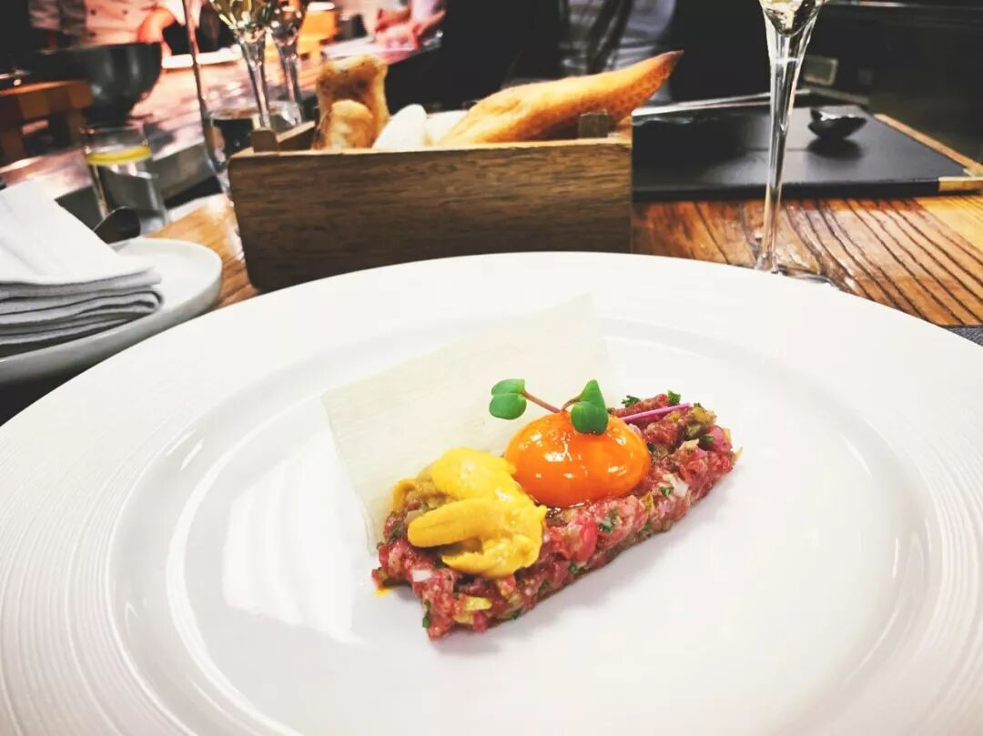 接下来的虽然也是肉菜,却让味蕾稍作休息,迎接下面的美味。梨的甜降低了牛肉的油腻感,脆饼搭配嫩滑的海胆和牛肉,滋味更上一个层次,加了wasabi和姜调味,整体口味偏日式,清新淡雅。