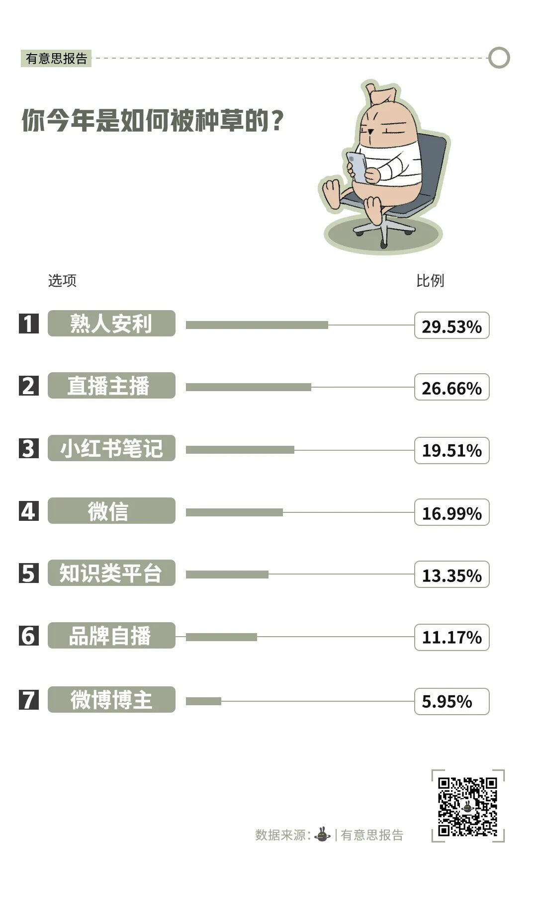 在种草方式上,熟人安利还是主流,占比近三成。值得注意的是,直播主播的种草方式已经接近熟人安利,当代社会主播就是最熟悉的陌生人。