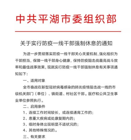抗疫是场攻坚战,为了让基层干部身体健康有保障,保证持续有力抗击疫情,平湖市委组织部近期发出《关于平湖市防疫一线干部强制休息的通知》,高志龙就是全市首位接到《强制休息通知单》的干部。