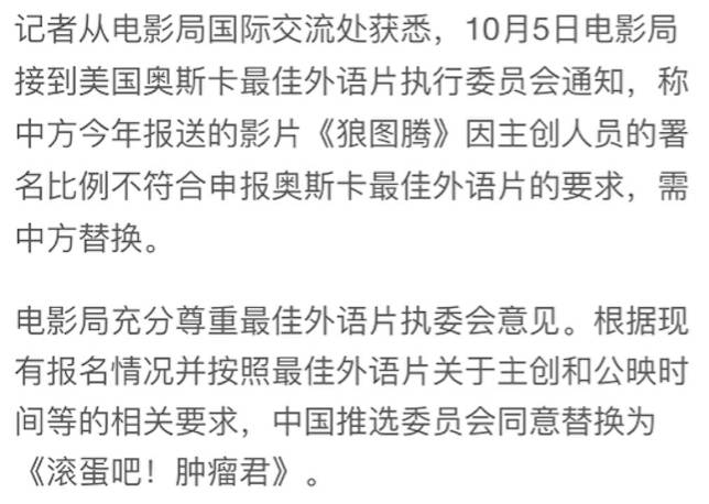 这两天闹得最沸沸扬扬的一个新闻,是《滚蛋吧!肿瘤君》临时顶替板上钉钉的《狼图腾》,被广电总局选送参加奥斯卡最佳外语片奖的评比。所有人都在问为什么,现在原因出来了。