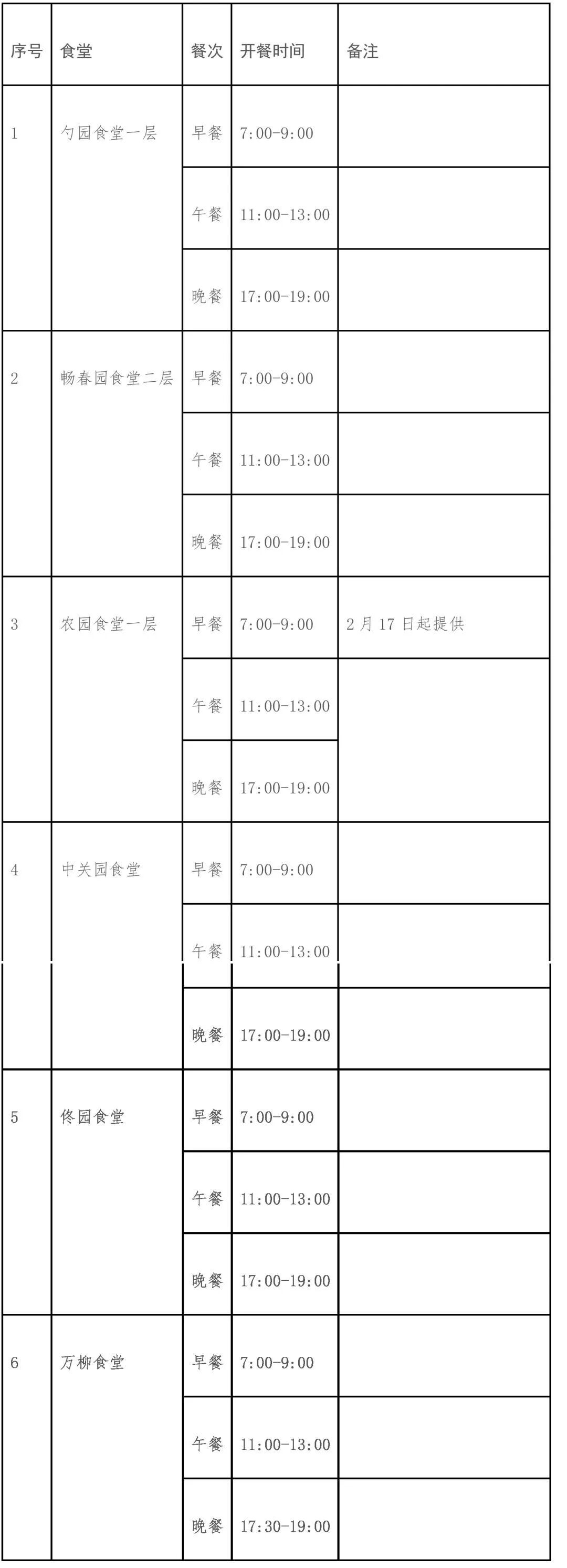 调整后,当前至正式开学前学校开餐食堂为:勺园食堂一层、畅春园食堂二层、农园食堂一层、中关园食堂、佟园食堂、万柳食堂(具体开餐安排见下表)。其他食堂的开餐时间,将根据学校春季开学时间和后续工作安排另行通知。