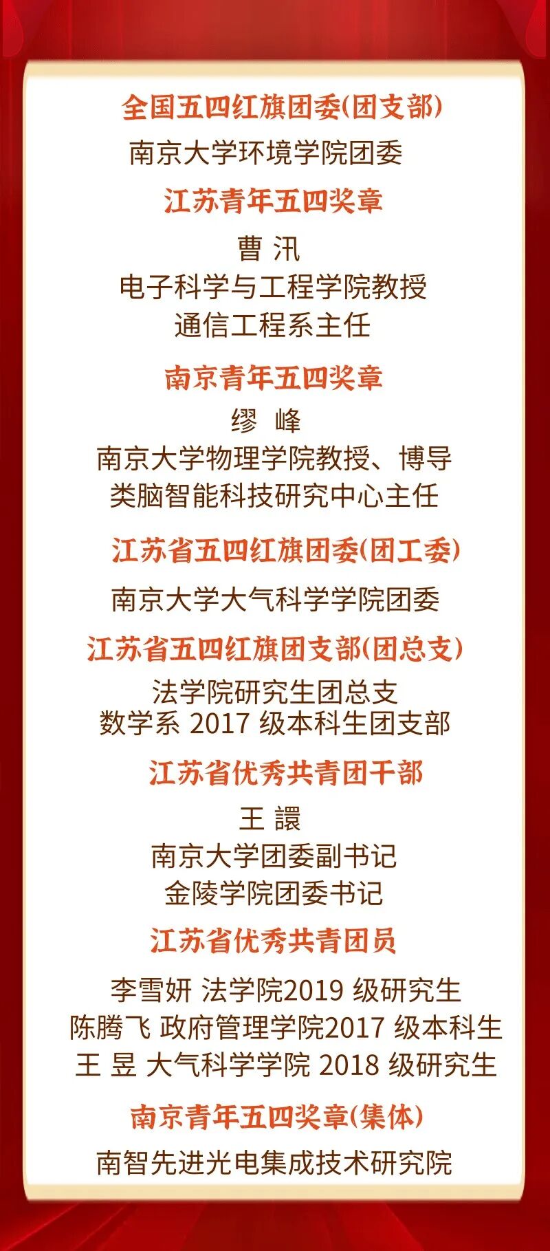 “五四”青年节前夕,共青团中央发布《共青团中央关于表彰全国五四红旗团委 (团支部)、全国优秀共青团员、全国优秀共青团干部的决定》,我校环境学院团委荣获2020年度“全国五四红旗团委(团支部)”称号。与此同时,我校电子科学与工程学院教授、通信工程系主任曹汛获评第16届“江苏青年五四奖章”;物理学院教授、博导、南京大学类脑智能科技研究中心主任缪峰获评第五届“南京青年五四奖章”;以我校固体微结构物理国家重点实验室和现代工程与应用科学学院等为主要依托的南智先进光电集成技术研究院获评第五届“南京青年五四奖章集体”。