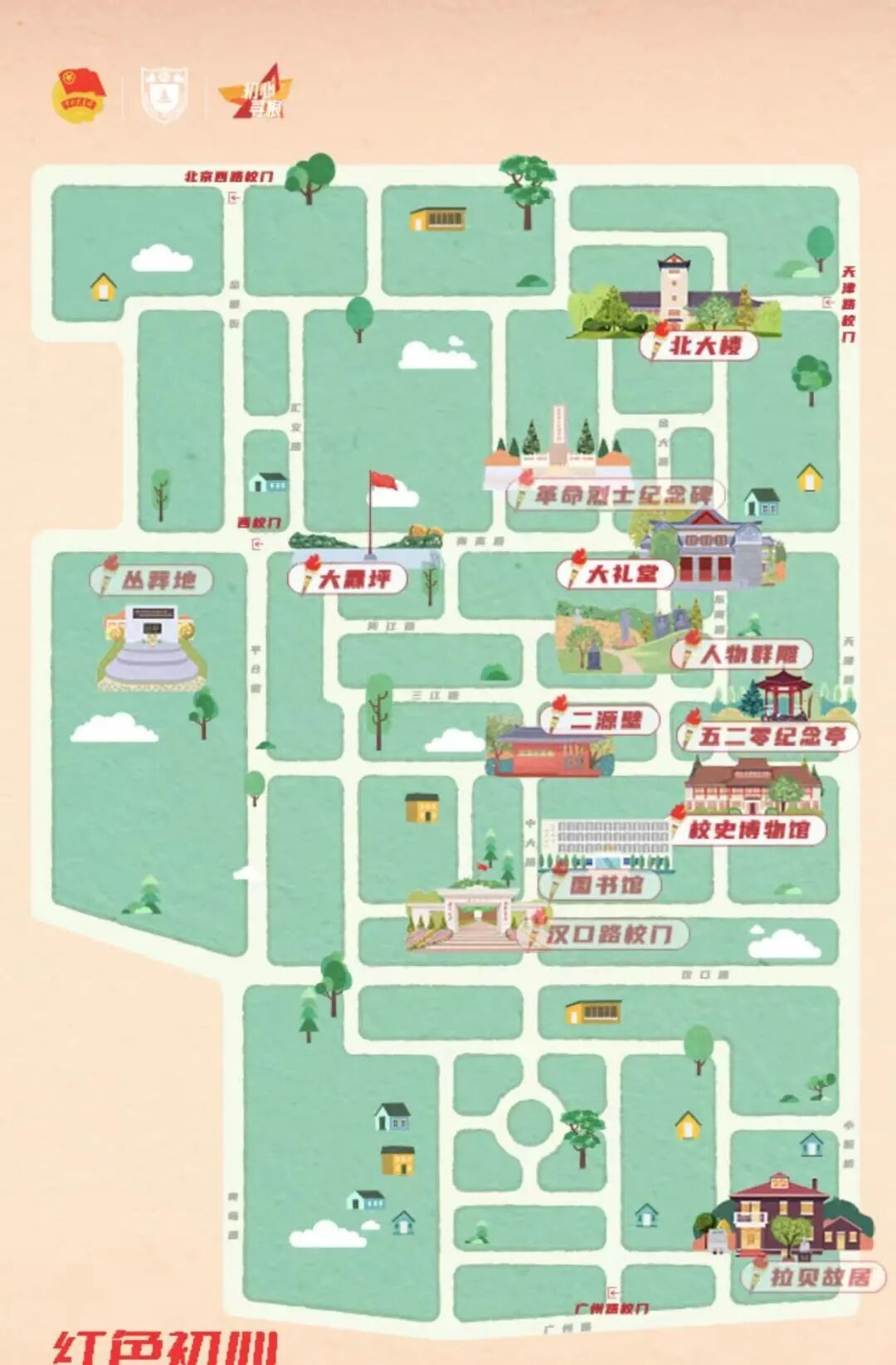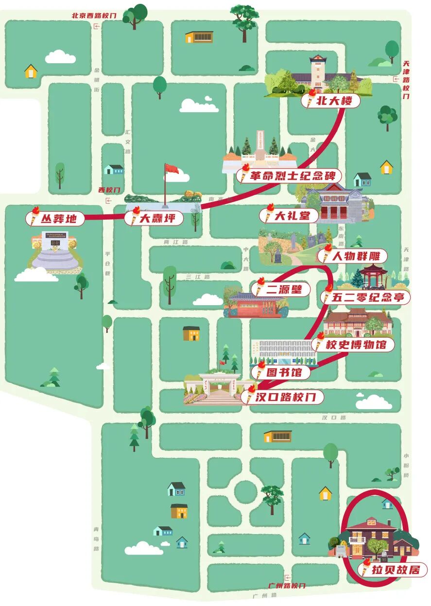 “红色初心寻根路”由“1”号、“2”号和“0号”三条子路线组成,覆盖了鼓楼校区12处承载着厚重历史与时代精神的古建筑。