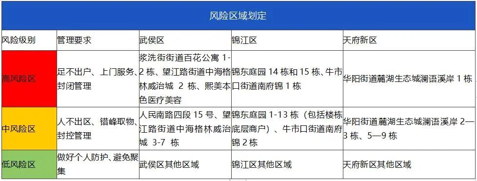 7月16日下午,成都市人民政府新闻办公室疫情防控工作新闻发布会通报,根据科学分类管控的原则,经过省市专家的研判,目前成都市共有高风险区5个,中风险区5个,低风险区3个,具体风险区区域地址将通过“健康成都”官微公布,由风险区社区以及相关的医疗卫生机构负责提供充分的医疗和生活保障。