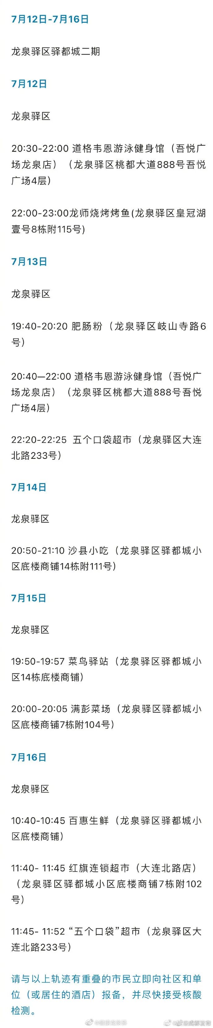 据健康龙泉驿(微博)消息,因疫情防控排查需要,请与以下时间和空间有重叠人员,立即向所在社区(村)、单位、宾馆主动报备,做好个人防护,配合做好核酸检测等疫情防控措施。