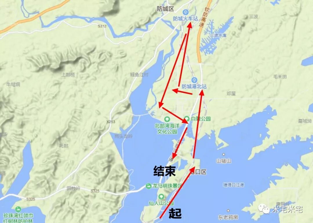 调研路线走的是一个闭环。起于港口老城区最南端,顺着东兴大道一路向北,往后从江山大道往西,再从金茶花大道一路向北去防城区老城,回来时沿着北部湾大道一路向南,止于港口区西湾豪宅区。
