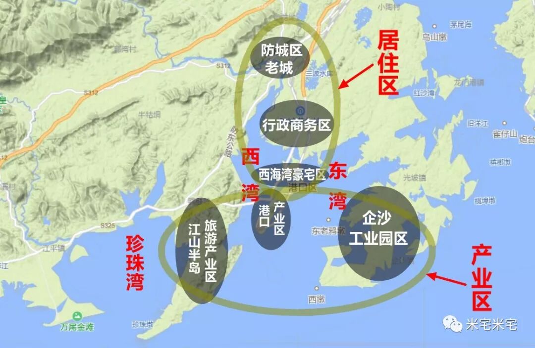 一个是居住区,包含防城区老城、新的行政商务区和港口区老城的西湾豪宅区。