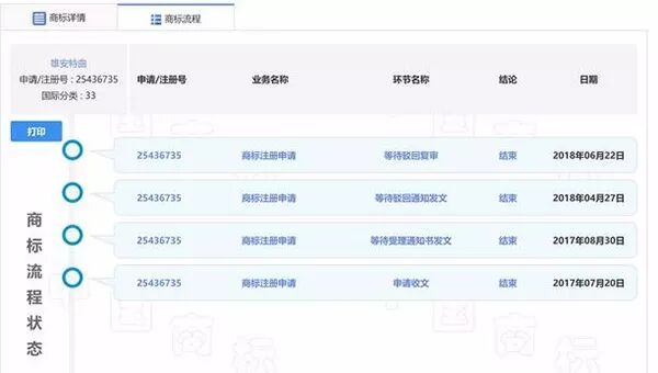 ▲在售“雄安特曲”公司申请的该商标申请流程。图片来源:商标网截图
