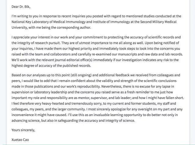 18日凌晨,曹雪涛在同行评议网站“pubpeer”发文,回应了Elisabeth Bik对他部分论文的质询,表示正在仔细检查手稿、原始数据和实验室记录,并补充说,“我仍然对这些论文中得出的科学结论的有效性、牢靠性以及研究的可重复性,充满信心。”