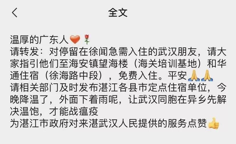 另一方面,在做好“防控”的同时,也要做好配套服务,保证武汉返乡人员以及武汉游客的基本权利——我们看到,在广东等一些地方,为武汉朋友提供了免费的宾馆,“让武汉同胞在异乡先解决温饱,才能战胜疫情”。这些做法既有利于集中进行消毒防控,也温暖人心。