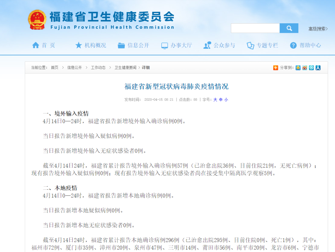 4月14日0—24时,福建省报告新增本地确诊病例0例。