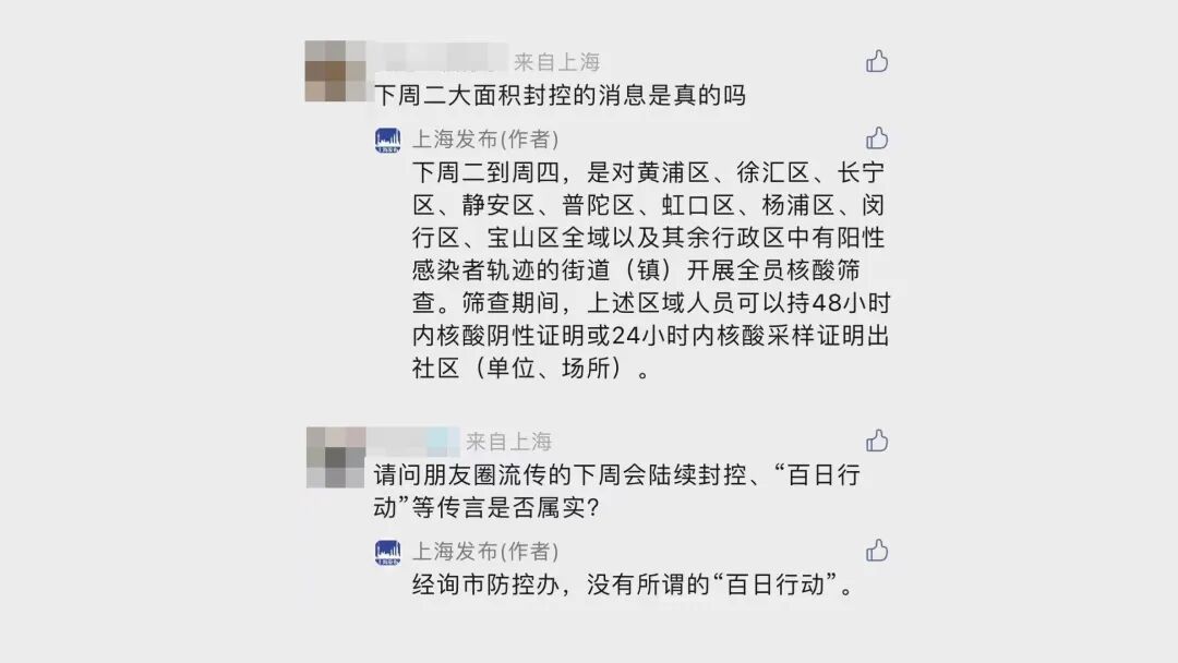 7月10日,有网友在“上海发布”微信公众号留言询问,下周二大面积封控的消息是真的吗?