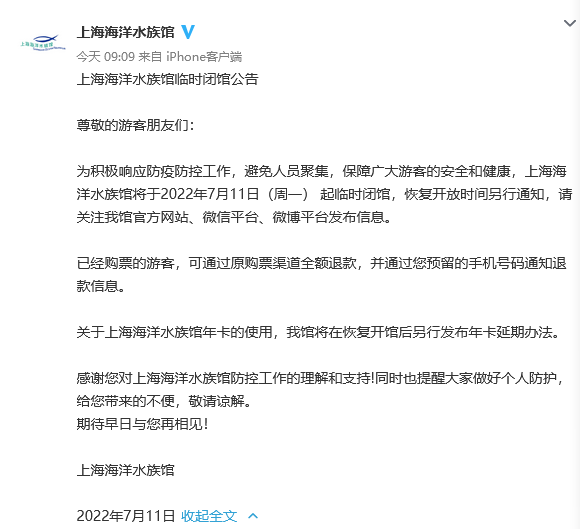上海海洋水族馆发布临时闭馆公告,全文如下:
