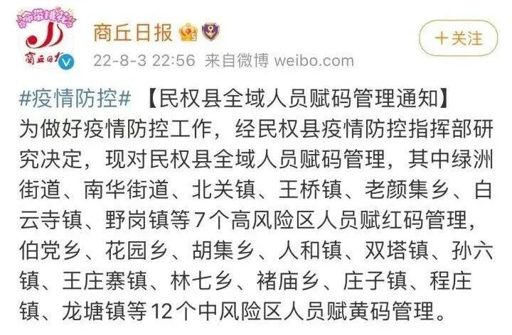 8月3日晚间,商丘市民权县发出“全域人员赋码管理通知”,决定对全域人员赋码管理,其中绿洲街道、南华街道、北关镇、王桥镇、老颜集乡、白云寺镇、野岗镇等7个高风险区人员赋红码管理,伯党乡、花园乡、胡集乡、人和镇、双塔镇、孙六镇、王庄寨镇、林七乡、褚庙乡、庄子镇、程庄镇、龙塘镇等12个中风险区人员赋黄码管理。