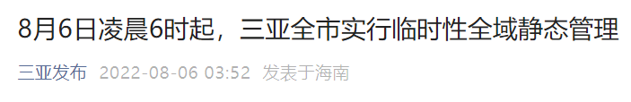 自2022年8月6日凌晨6时起,三亚全市实行临时性全域静态管理,除保障社会基本运行服务、疫情防控和紧急特殊情况外,三亚全市范围限制人员流动,暂停城市公共交通。恢复时间另行通告。