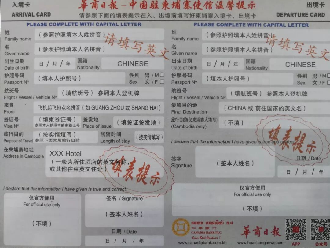 办理入境手续时,须向移民局官员提交填写完整的入境卡,柬官员将入境卡收存,将空白出境卡钉在护照内,当事人出境时须在办理出境手续前完整填写出境卡。入境时须遵守柬埔寨有关入境携带物品、外汇等相关规定,并填写海关申报单交给海关官员,配合柬方执法检查。
