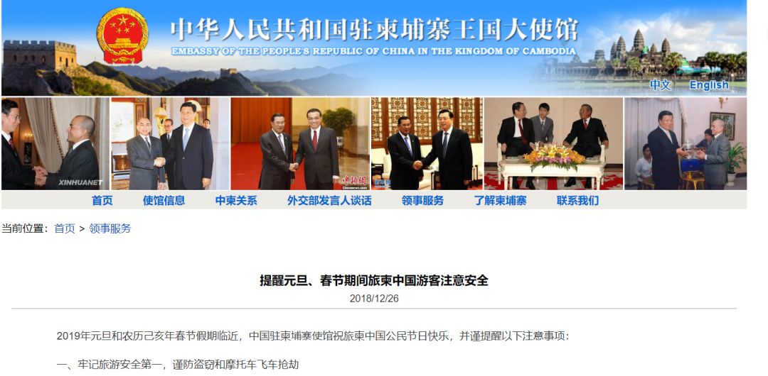 2019年元旦和农历己亥年春节假期临近,中国驻柬埔寨使馆祝旅柬中国公民节日快乐,并谨提醒以下注意事项: