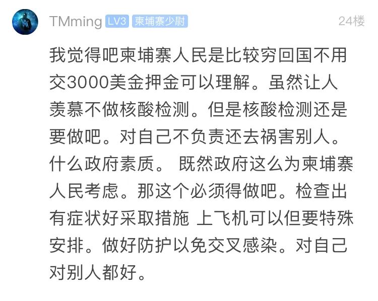 有网友提出,柬埔寨人民是比较穷,回国不用交3000美金押金可以理解。不做核酸检测虽然令人羡慕,但还是应该要做的。不然的话是对自己不负责,还会祸害他人。既然柬埔寨政府为民众考虑,那么就该要求所有入境乘客提供核酸检测报告,对于感染者允许上飞机,但要特殊安排,做好防护,以避免交叉感染。
