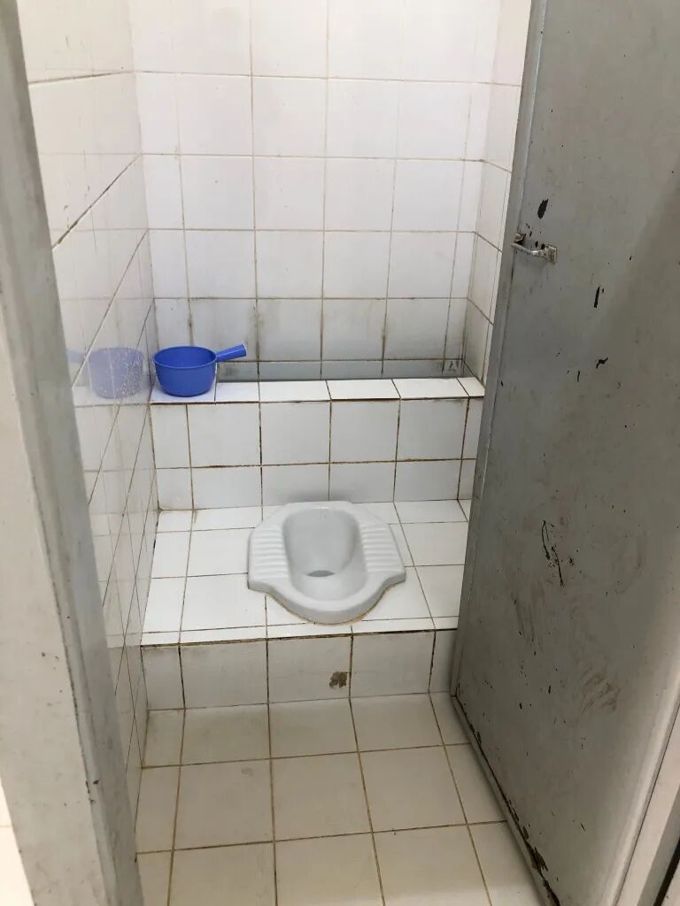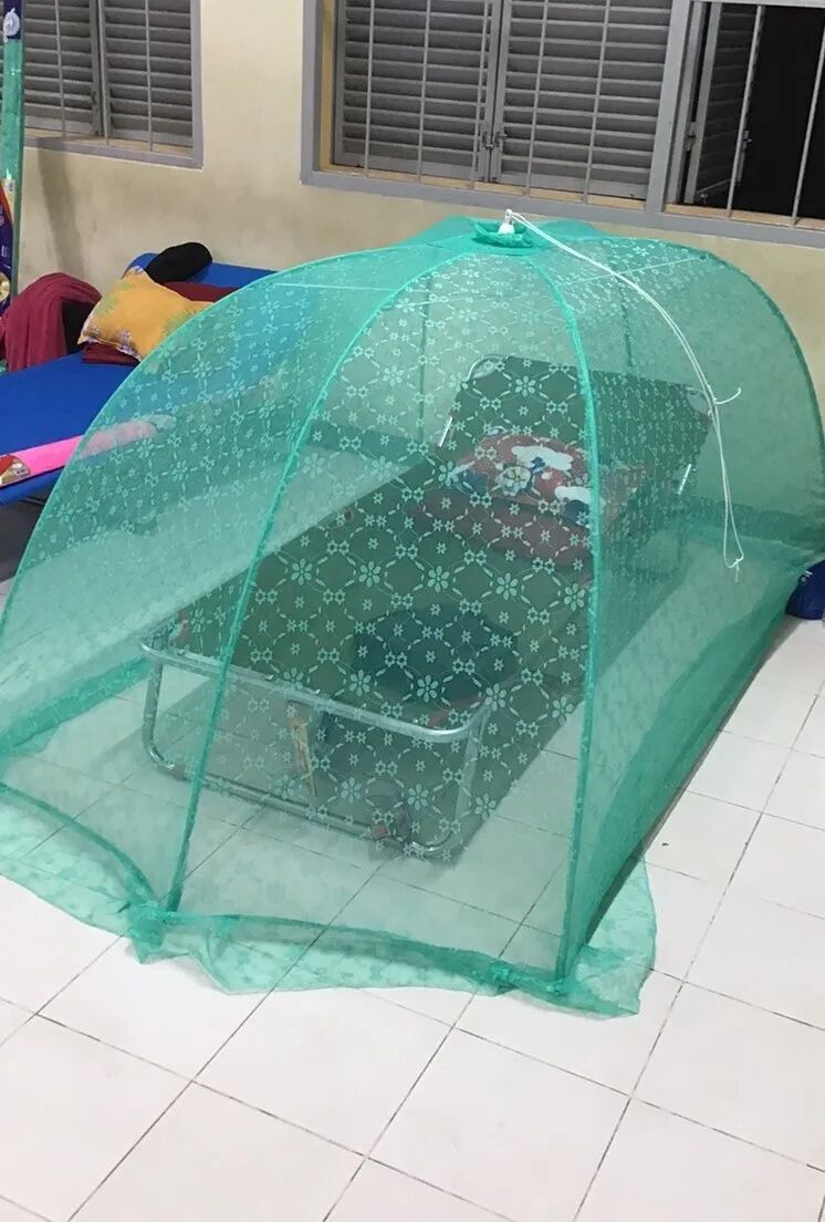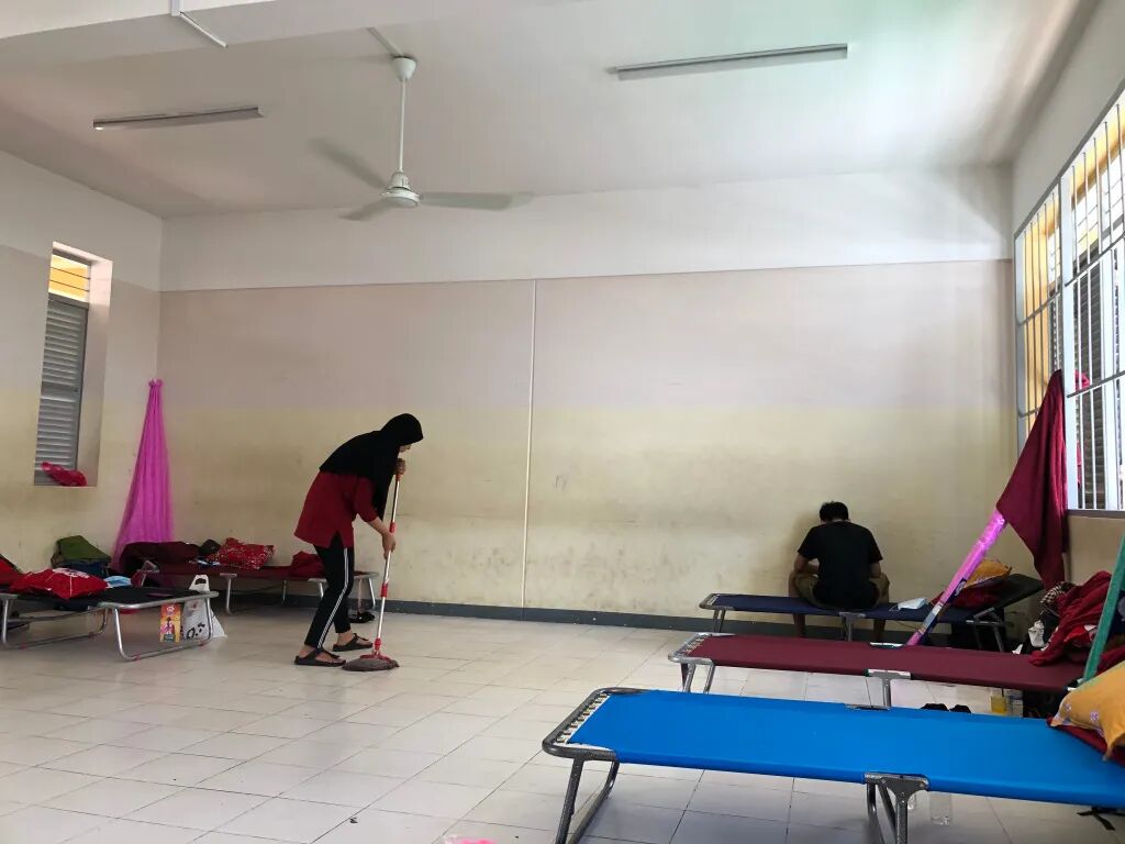 检查完个人资料后,每8个人被安排入住一个房间,由于是学校改成的隔离点,设施较为简陋,甚至没有真正的床,只有8张行军床配有枕头和毛毯,还有蚊帐。整个房间只有2把吊扇,厕所没有水龙头。