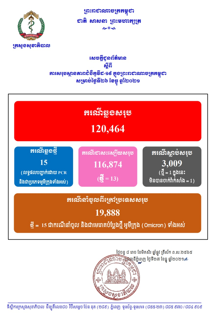 12月27日,柬埔寨卫生部发布通告,12月26日柬埔寨新增15例奥密克戎确诊,均为境外输入确诊病例,新增13例治愈,新增1例死亡病例(1例未接种疫苗)。