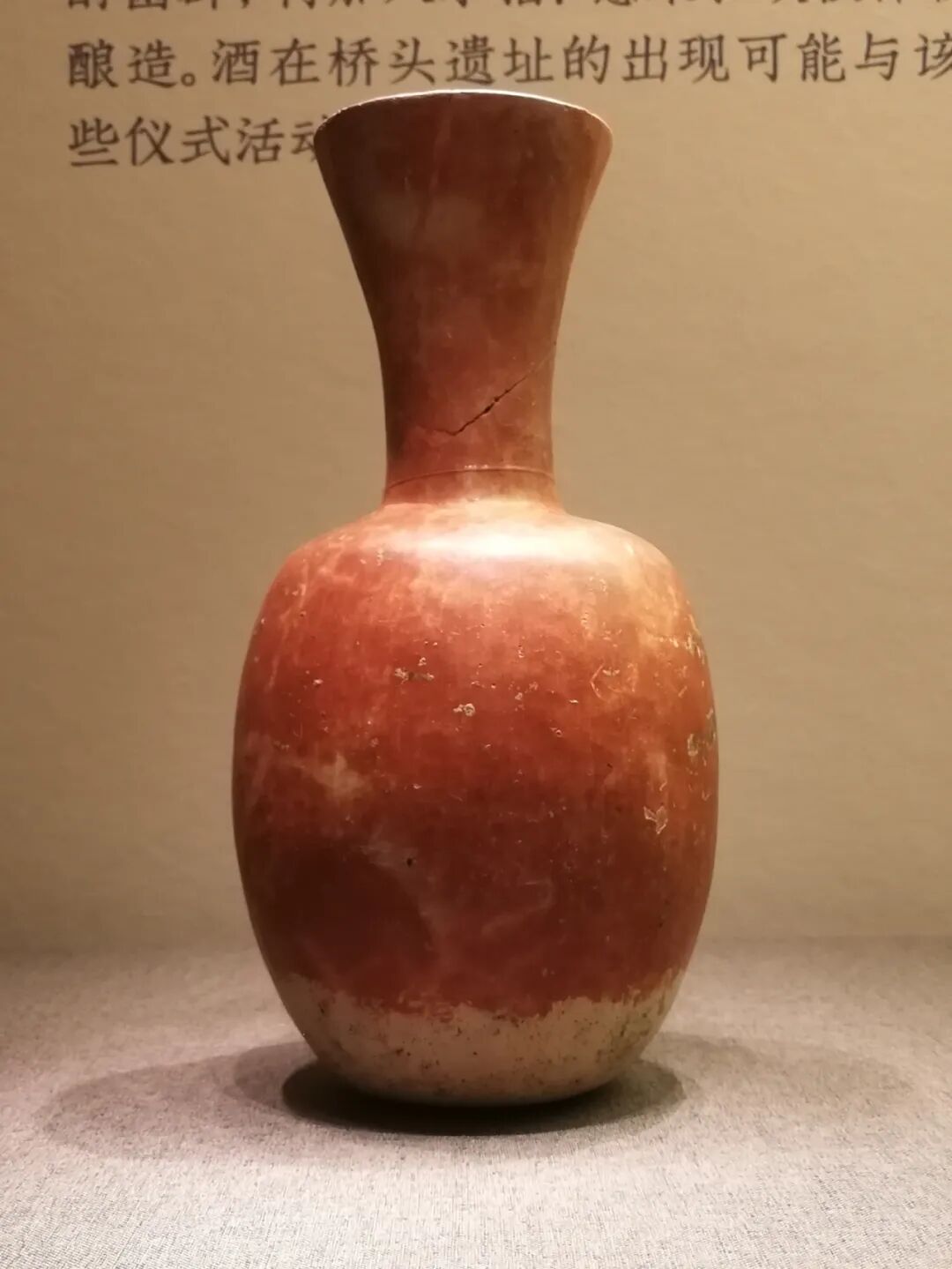另一件精美的椭圆肚细高颈陶瓶,经研究证明是储酒用品,酿酒原料推测有水稻、薏米和块茎植物。斯坦福大学东亚语言与文化系教授刘莉教授提出,为什么这么早的时期,陶器多样化和栽培谷物一同出现就有酒了呢?这是长期以来的争论话题——农业的动力到底是什么?是为了生产出更多的粮食,足够人吃呢?还是用这些栽培的粮食去制作一些特殊的食品比如酒?酒的功能不是填饱肚子,而是作为一种中介物,是调节各种社会关系的润滑剂,同时也是连接人与神、人与祖先的中介。或许就是这种原始的互动需求,同时孕育了(酿酒)技术与(巫术)文化。