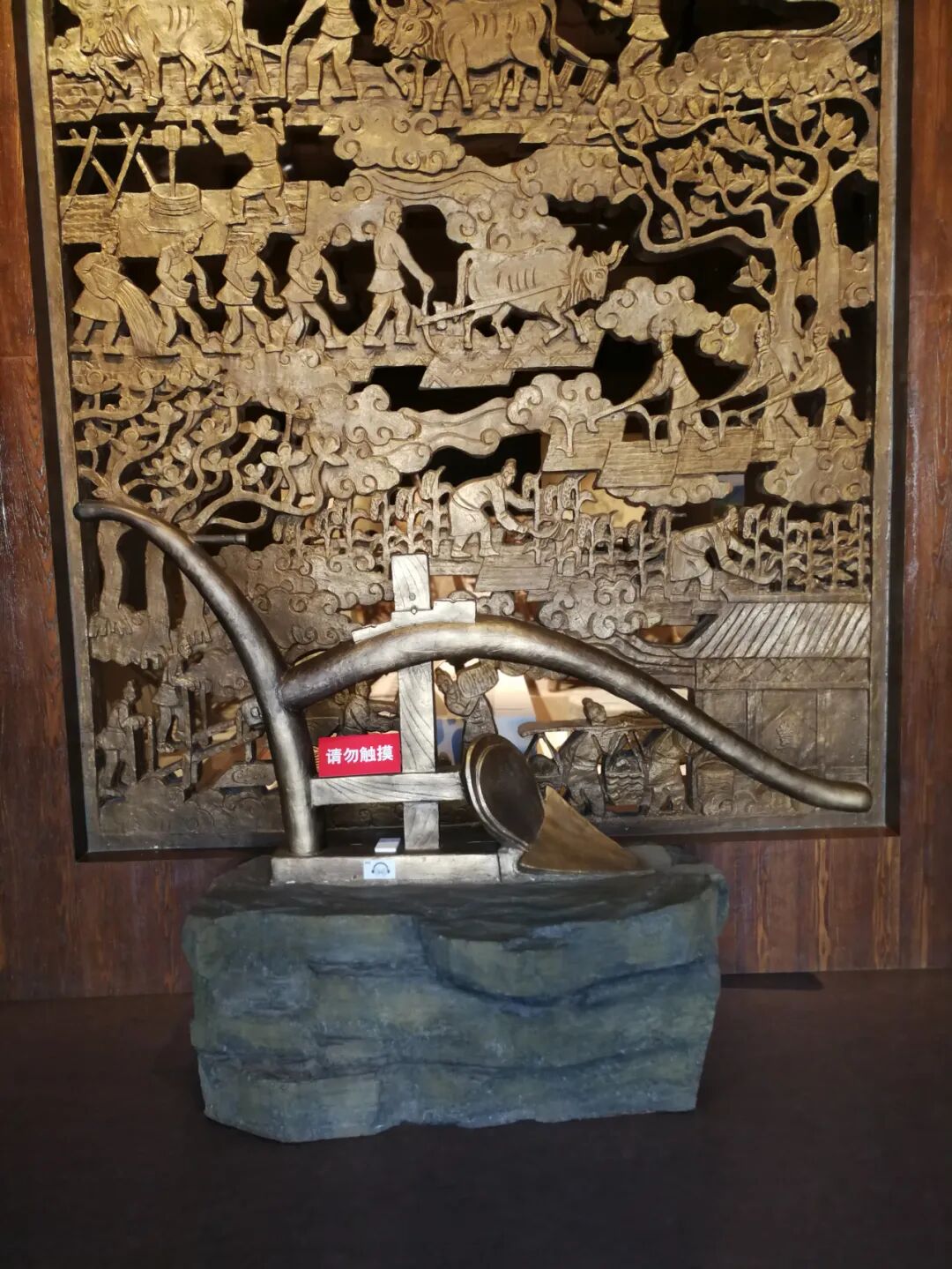 中国农业博物馆农具展厅入口处的江东犁(后世称为曲辕犁)雕塑。
