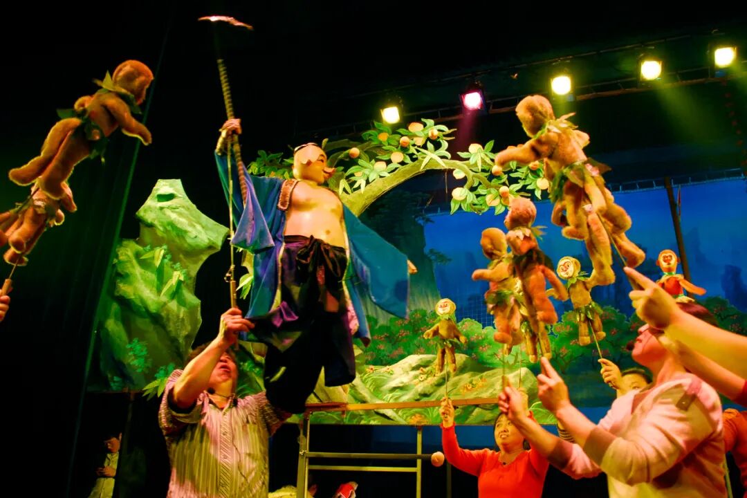 木偶戏分为提线木偶戏、杖头木偶戏、布袋木偶戏、铁线木偶戏等。“孝义木偶属于北方派系的杖头木偶,因为它由三根棍杖配合完成表演。”孝义市皮影木偶剧团团长刘亚星说,孝义木偶戏又称举偶,其特点是真人在下、木偶在上,艺人通过插于木偶上的一根木杖和两根操纵木偶手的细铁棒来操作整个木偶。经多年钻研,如今的木偶还可表演喷火、舞长绸、甩花翎等动作。
