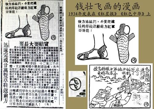 1934年钱壮飞撰写的《迅速完成廿万双草鞋送前方》和为文章创作的漫画《要长大要结实》刊登在《红色中华》上(资料照片)。新华社发