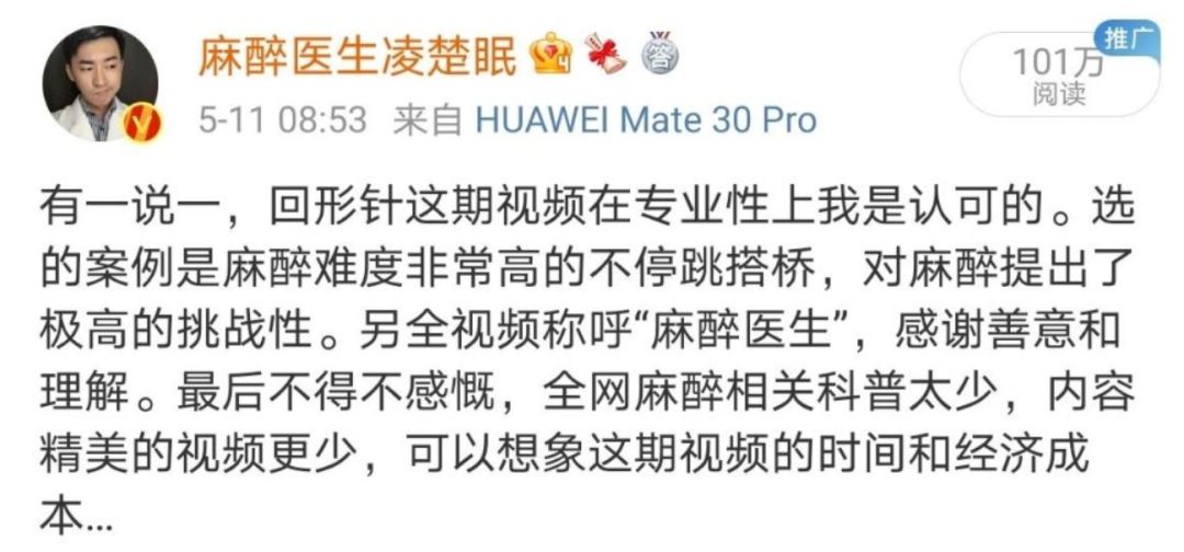许多麻醉行业的医生都纷纷到视频下面留言点赞,看起来,“回形针”不但没死,仅仅靠着一部“理中客”的视频,他们又能把自己洗白了。这就叫“舆论的阵地,我们不占领,敌人就要占领”,我们正常的科普工作者没有像他们这样疯狂炒作,寻找舆论热点,刷存在感,所以,他们就占了舆论阵地。