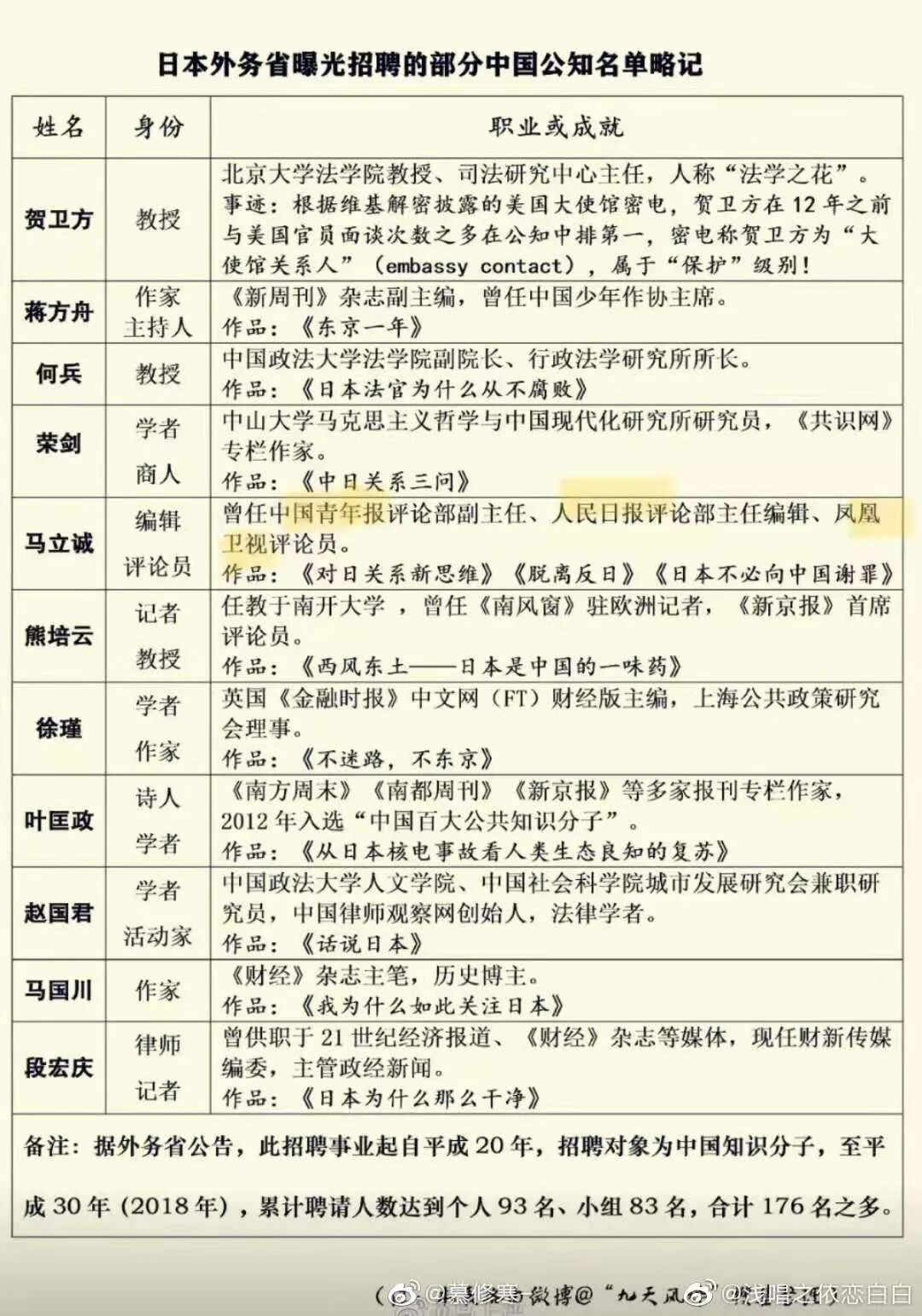 看看这份名单,除了蒋方舟这个不学无术、浪得虚名、只知道看舞女大腿的文坛混子之外,其他人都是著名学者、作家、教授。何兵教授的《日本法官为什么从不腐败》、马立诚的《日本不必向中国谢罪》、熊培云的《西风东土——日本是中国的一味药》,都是“精日”圈子的“名著”。