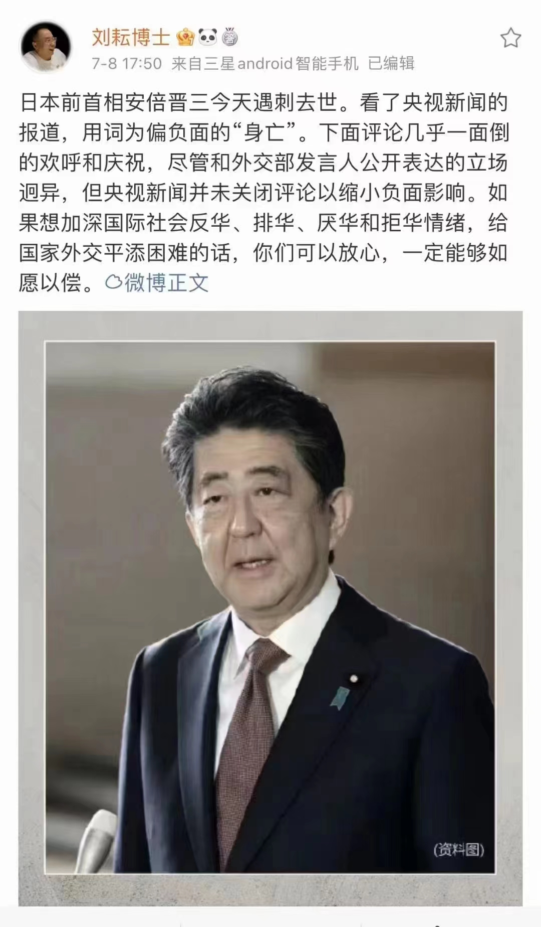 然而,日本右翼政客安倍被刺身亡的那天,中文互联网各种各样层出不穷的“哀悼”、“纪念”、“以泪洗面”令我震惊,仿佛死的不是个日本右翼政客,而是“精日”的亲爹。