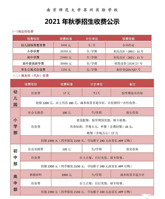 6月29日,南师大苏州实验学校宣布,高中费用按照公办高中的标准收取。即一学期费用从3w调整为850元。