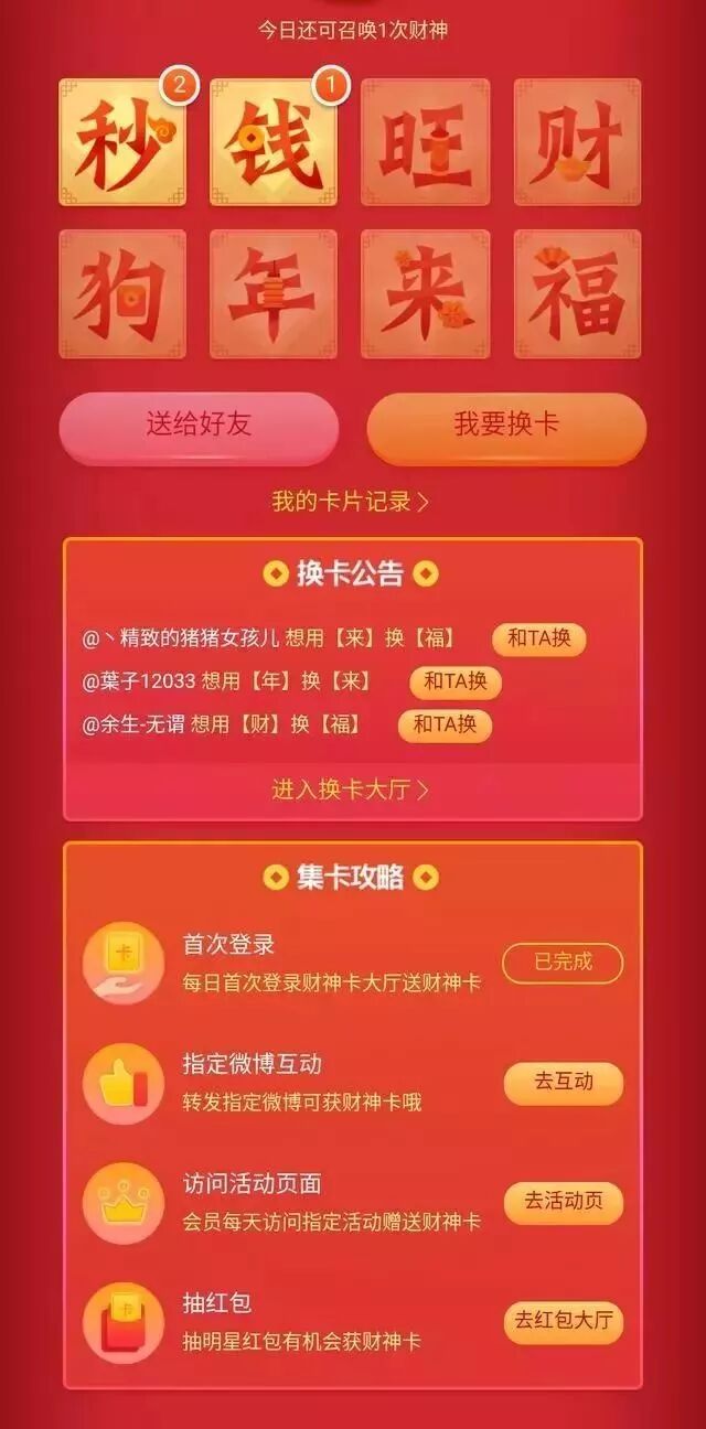 集齐“秒钱旺财狗年来福”,召唤财神领大奖。