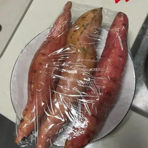 3、 把红薯放进大碗,碗上覆盖保鲜膜,保鲜膜扎孔或留口。