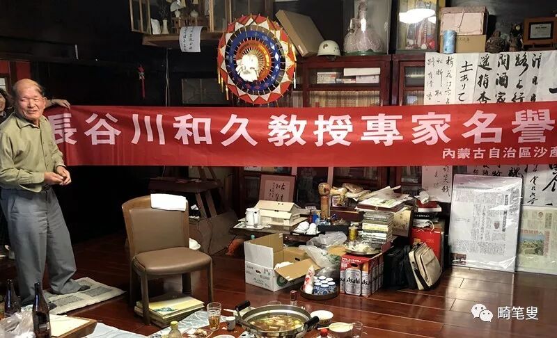 一面墙壁上掛满了条幅与照片。条幅全是汉文书法作品。在一个镜框里,我们还看到了1970年代中日恢复邦交时的首相大平正芳的题字:在素知赘。