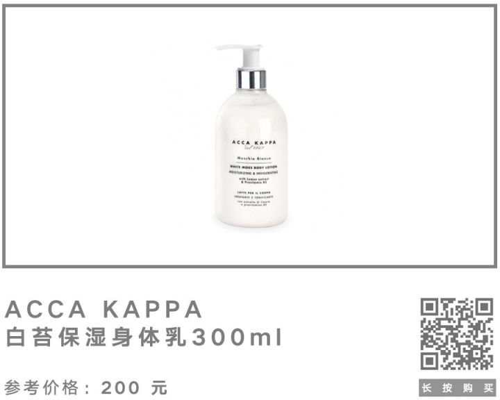 ACCA KAPPA 是一家意大利的专业 SPA 产品品牌,迄今已有超过 130 年的历史,生产包括沐浴产品、蜡烛、精油等一系列产品。很多奢侈品酒店的浴室都可以见到它的身影。
