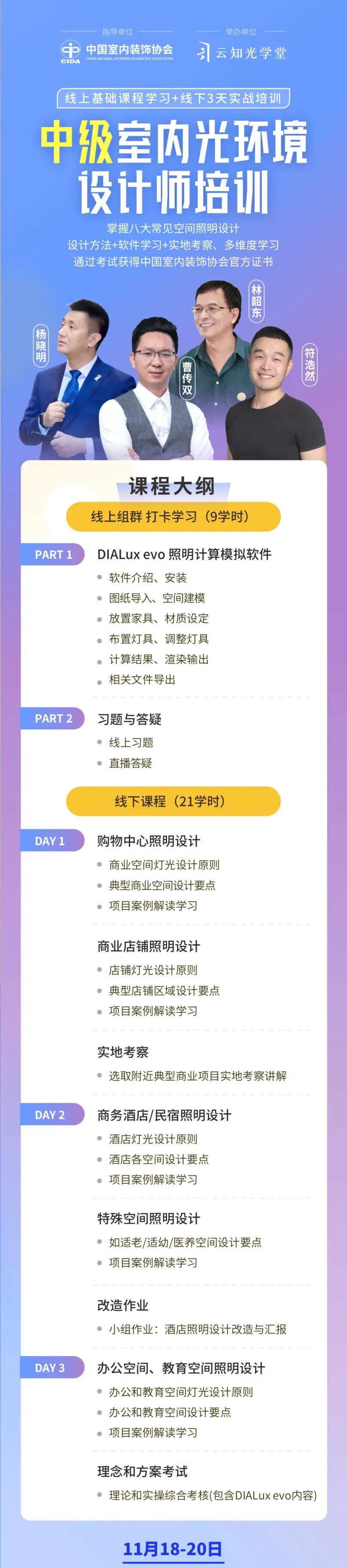 中级课程主要教授从 DIALux evo 照明计算模拟软件到商务酒店/民宿、购物中心、商业店铺(餐饮店铺/酒吧)、办公、教育、儿童空间、美容会所等常见室内空间的照明设计手法,实现健康照明的思维与方法,使设计师掌握照明设计的必备技能或获得能力进阶提升,能够用灯光强化室内主题设计概念。