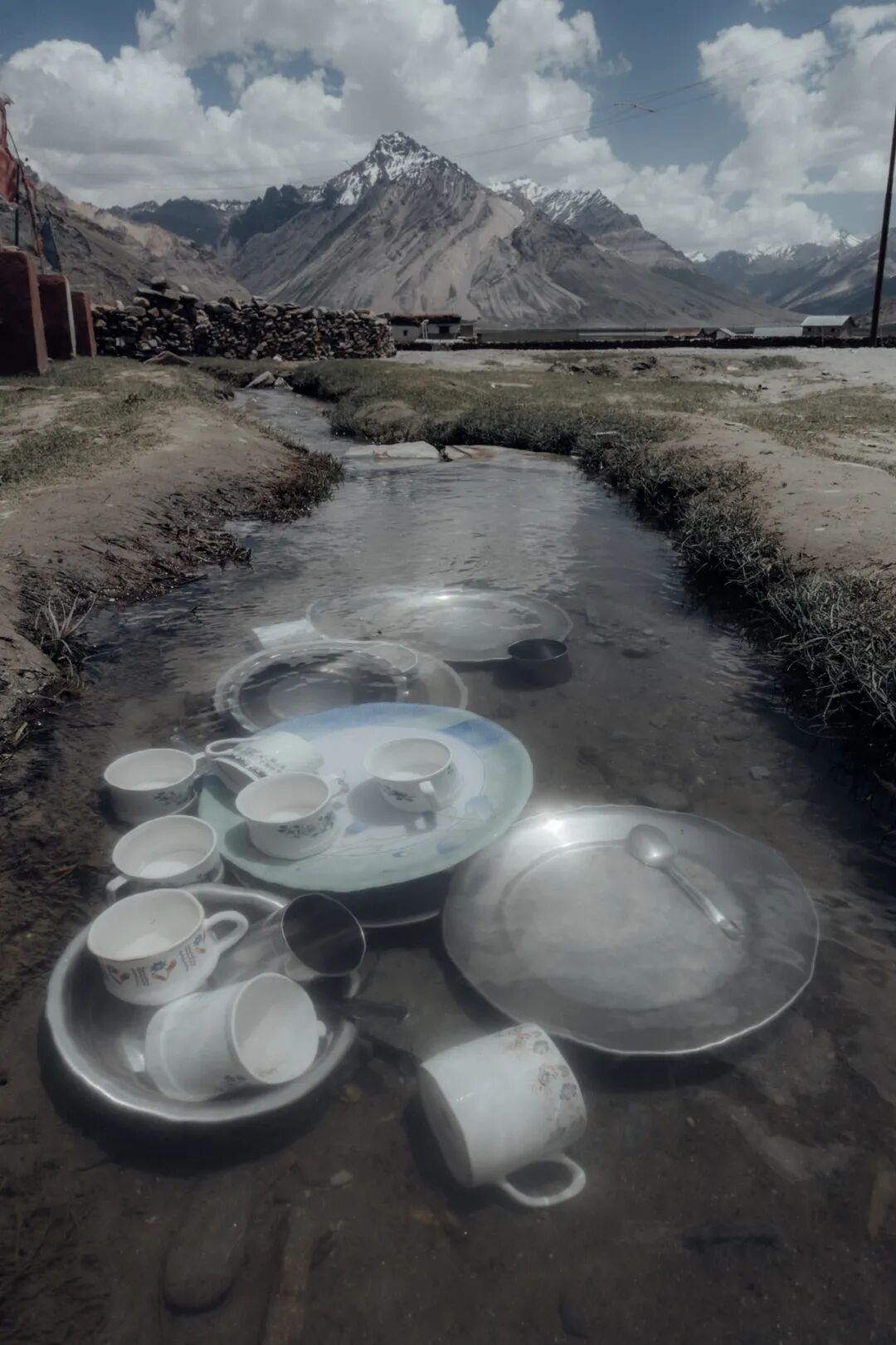 饭店的碗碟杯子就在门口的引水渠里洗涤