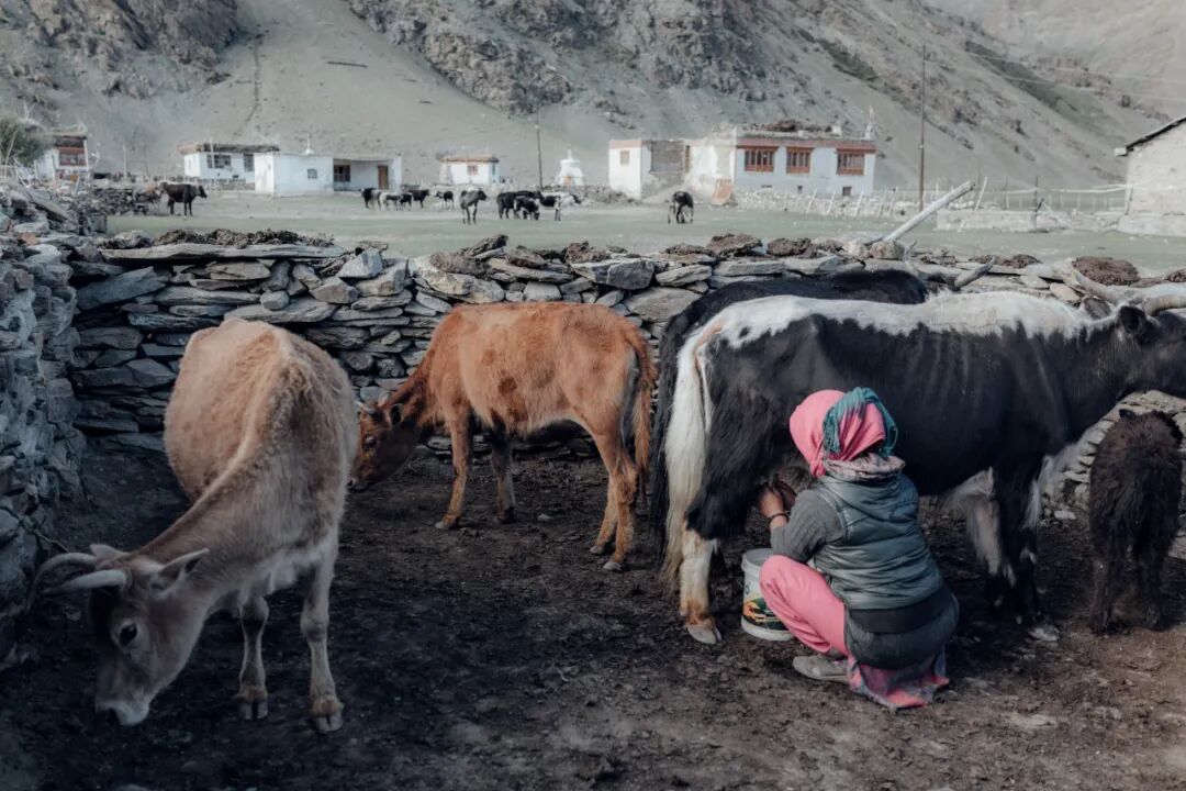 我来简单描述一下兰顿村民是如何生活的,概括起来就是十六个字——交通靠走,通讯靠吼,食物靠牛,治安靠狗。兰顿村海拔在3900米左右,这里一年中有一半的时间这里会大雪封山,夏季通公路的时候,男人们外出工作挣钱,女人们每天放牧劳作照看孩子,村里的青壮年男性很少。他们过着现代人难以想象的生活——白天日照充足的话,晚上有限时段的照明供电,可以看会儿电视;没有任何一个电信运营商在这里架设基站,所以打不了电话,紧急情况下可以通过卫星通讯跟外界联络。入冬之后当地的人们除了徒步几乎哪儿都去不了,没有物资补给,他们需要在半年通公路的时间里,储备够另外半年的柴米油盐等生活物资。夏天他们每天外出放牧,傍晚的时候会看到村民们赶着自己家稀稀拉拉的牛羊群从外面回来。但由于当地村民笃信佛教,他们放牧,却并不将牛羊杀来吃,只是为了获取奶制品和羊毛,用牛羊跟外界换取物资。唯有在拉达克新年时候,几户人家才会分着杀一头牛来吃。当地养的牛是一种牦牛与黄牛的混血品种,产奶量比牦牛要高。牛尽管一年四季都能产奶,但冬天由于饲料匮乏及发情哺乳周期等综合原因,产奶量会大幅下降。他们会在夏天尽可能把多余的牛奶制成各种耐储存的奶制品——酥油、酸奶干等。依靠着有限的暖棚,夏天种的蔬菜可以自给自足,但入冬之后就算暖棚里也长不出任何作物,他们会在入冬前腌制一些泡菜。当地人冬天的主食通常就只有米饭、豆子糊糊、糌粑这些东西,会在地窖里贮存一些土豆、胡萝卜、洋葱、番茄、苹果,靠烧夏天积攒的木柴、牛粪来熬过严寒,窝在家里用羊毛做一些纺织的活计。