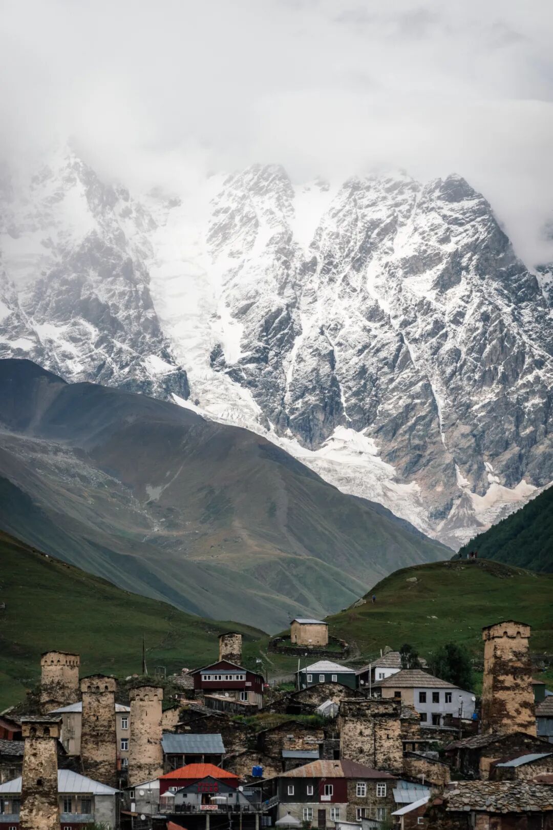 乌树故里背靠着巨大的什哈拉山(Shkhara),海拔5193米,是格鲁吉亚境内的最高点,也是高加索山脉的第三高峰。沿着流经乌树故里村庄的那条河往上游溯源,走五公里左右就会抵达什哈拉山的冰川。什哈拉山的另一个名字叫做——别津吉墙(Bezingi wall),我没有查到Bezingi究竟是什么意思,但我得说“墙”这个词真的非常贴切。别津吉墙是一道12公里长的巨大而陡峭的山脉,在乌树故里眺望别津吉墙会有一种巨大的压迫感,这座“墙”绝对就是我们这个现实世界中的“绝境长城”,两边都有超过2500米的巨大落差,翻越别津吉墙被认为是整个欧洲最困难的冒险活动。不光是什哈拉山,整个斯瓦涅季北部的大高加索,都好像一道冰雪和岩石修筑的高墙,将另一个世界隔绝在墙的那边。