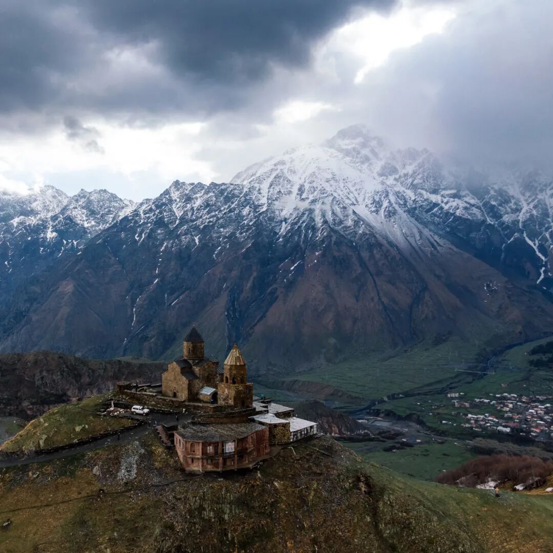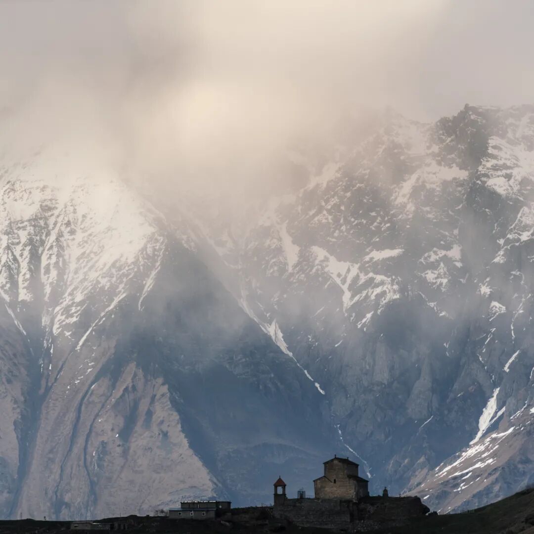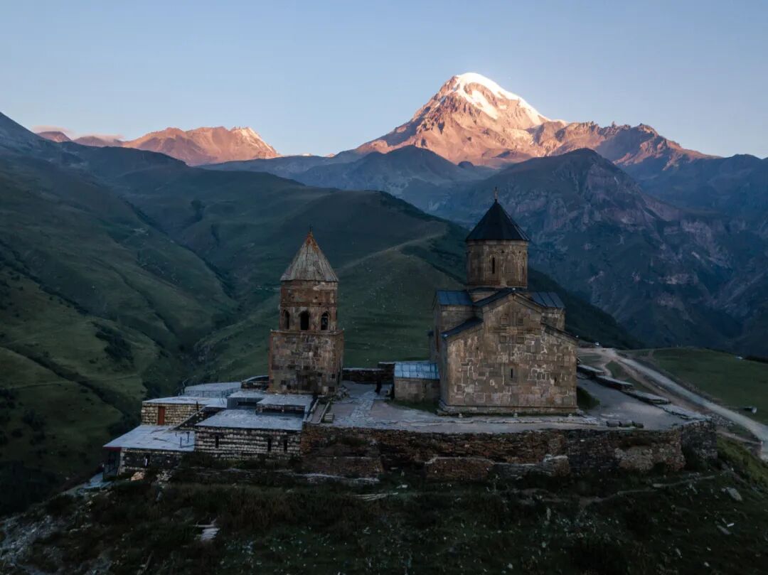 在斯特潘茨明达镇上仰望卡兹别克山,你所无法忽视的是位于山前的一座教堂——格格蒂圣三一教堂( Gergeti Trinity Church)。雪山的背景和教堂的前景,几乎是卡兹别克山的标准照。这座教堂始建于14世纪,矗立于悬崖之上,有着绝佳的开阔视野。在2018年底之前,都要需要徒步上山才能抵达这里,而现在有了一条崭新的公路直接通到这里。