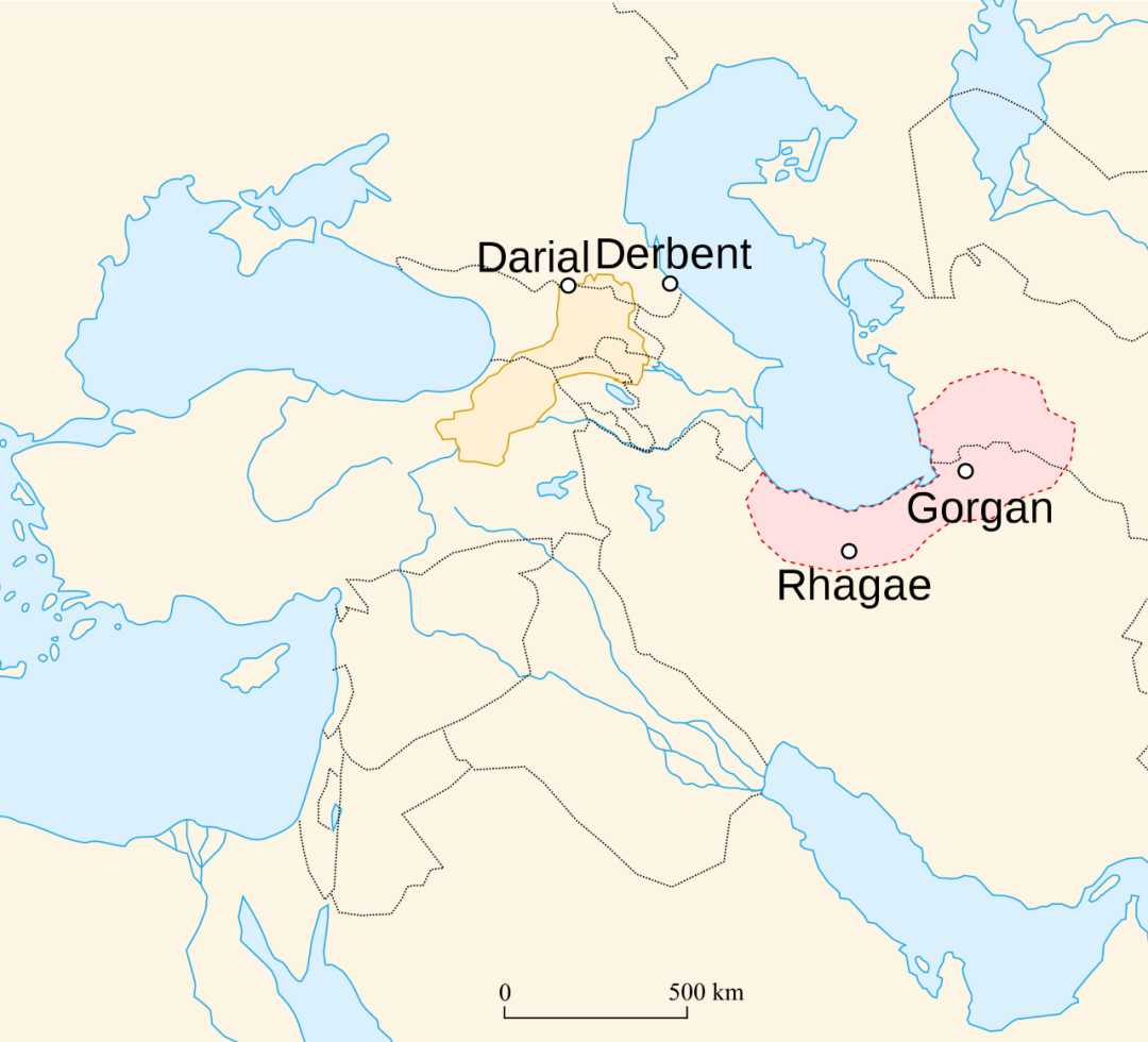 “亚历山大之门”的传说故事有着众多的版本,然而铁门究竟在什么地方却是众说纷纭,有人认为在杰尔宾特的“里海之门”(Caspian Gates,这个地方是真实存在的,后面的章节我会去探访),也有人认为就在达里尔峡谷,还有说法认为是里海东南岸的戈尔干长城(The Great Wall of Gorgan)。