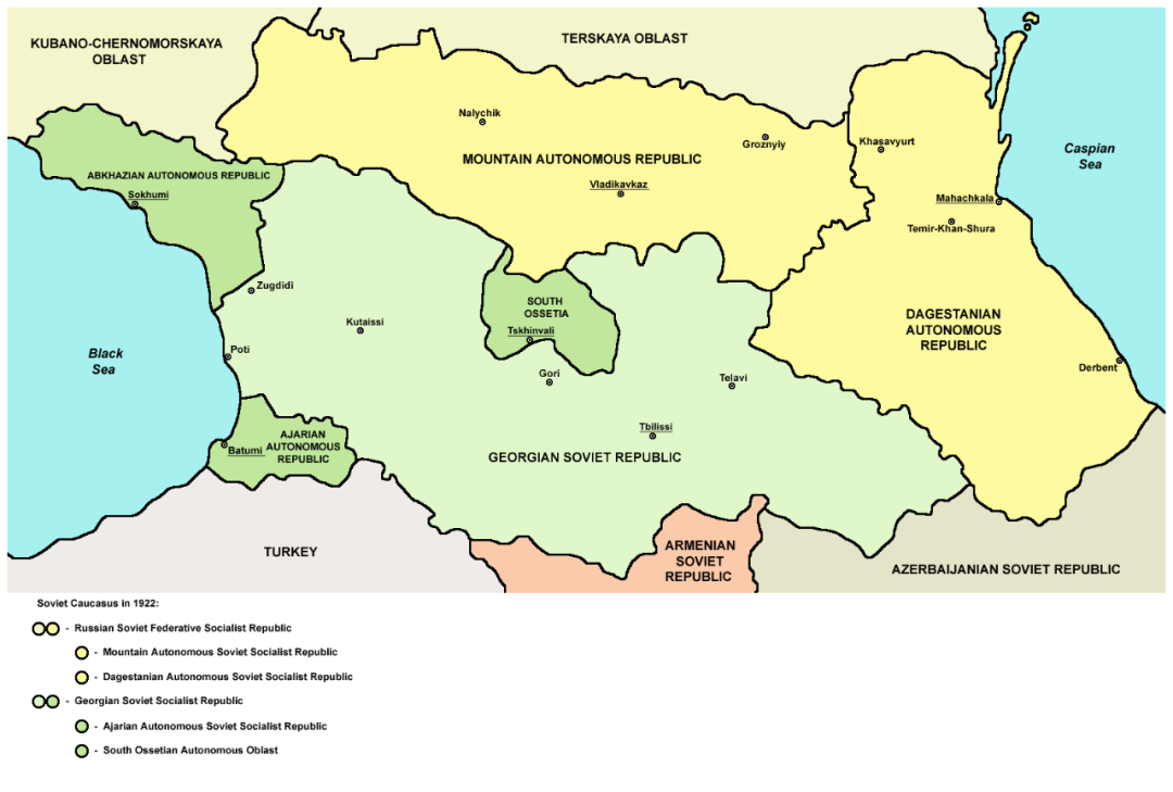 然而到了苏联红色政权时期,无神论的苏共上台,宗教信仰皆为牛鬼蛇神,于是在民族众多的高加索地区不可避免地发生了地方和中央的意识形态冲突,出现了叛乱。苏联中央政府为了便于管理和控制,预防性地把南北奥赛梯被分割到了不同的行政区域——北奥塞梯被划在布尔什维克派的山区苏维埃社会主义自治共和国(Mountain Autonomous Soviet Socialist Republic),南奥赛梯被划在孟什维克派的格鲁吉亚民主共和国,如此分裂格局延续至今。在之前《高加索列国志(二)“病毒斗士”亚美尼亚》章节里我曾经写过的纳卡地区跟南奥赛梯也是同样的性质,明明亚美尼亚人居多却被划给了阿塞拜疆,造成了如今无解的历史问题。苏联原本以为高于一切的共产主义意识形态认同能够压过民族认同的分歧,但事实证明并非如此。